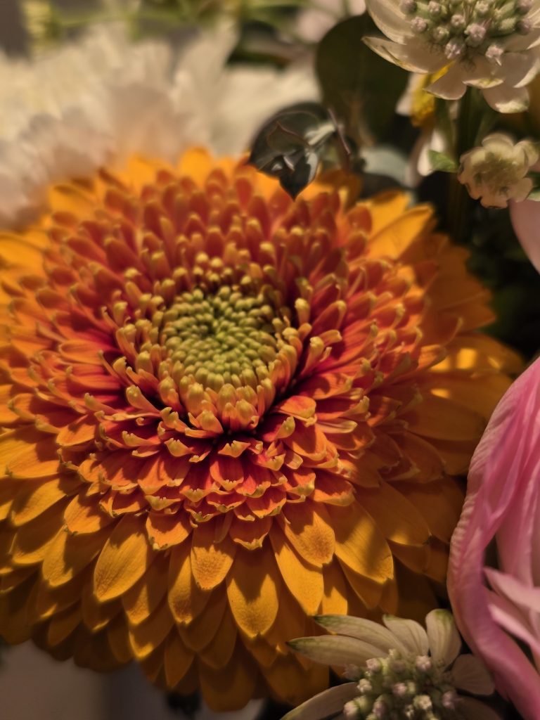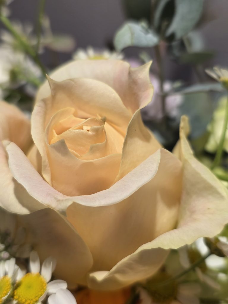 ピンク、オレンジ、クリーム、グリーン系のパステルカラーの組み合わせが、温かく優しい風をおくってくれているようです。ひとつひとつのお花も素敵ですが、ブーケにした時に別のひとつのお花に生まれ変わるようでいいですねー。ぜひ、近くでご覧くださいね。