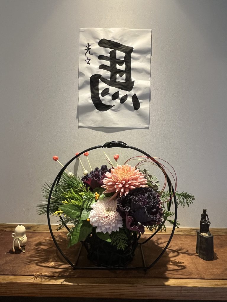 正月のお花と光ちゃんの書初め。左馬は逆から読むと「まう(舞う)」になり、福が舞い込むことを意味すると言われます。